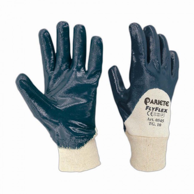 NBR gloves, cotton wrist, ventilated back. Internally lined. Good sensitivity and softness, suitable in agriculture field, loading and unloading, management of vehicles, mechanical field, metal manufacturing, housebuilding, general industry. CE EN 388:03 (4121) CE EN 420:03